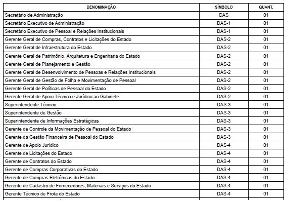 Art. 2º Ficam redenominados os cargos, em comissão, do Quadro de Cargos Comissionados e Funções Gratificadas da Secretaria de Administração, a seguir especificados, mantido o símbolo: