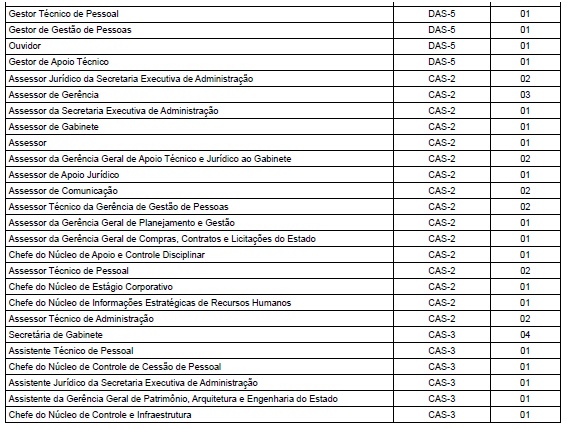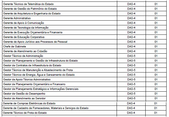 II - 1 (um) cargo de Superintendente de Gestão de Pessoas, símbolo DAS-3, passando a denominar-se Superintendente de Informações Estratégicas; III - 1 (um) cargo de Gerente de Telemática do Estado, símbolo DAS-4, passando a denominar-se Gerente Técnico de Telemática do Estado;
