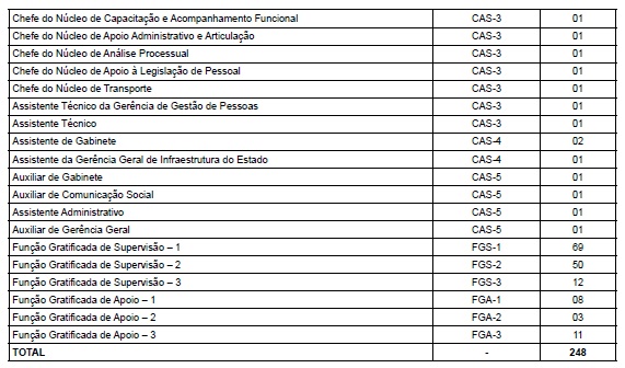 XXIX - 1 (um) cargo de Assistente do Gabinete, símbolo CAS-4, passando a denominar-se Assistente da Gerência Geral de Infraestrutura do Estado; e